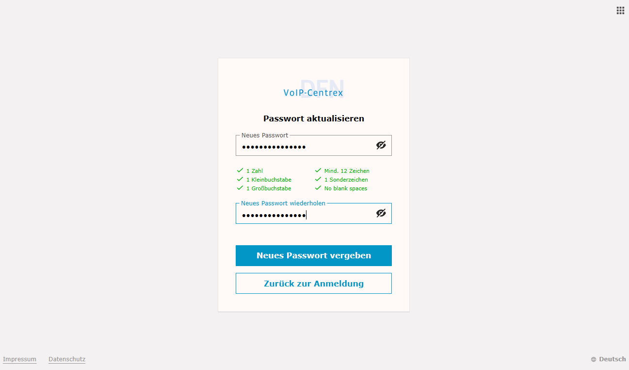 5. Geben Sie ein neues Passwort ein, das den aufgeführten Passwortanforderungen entspricht.