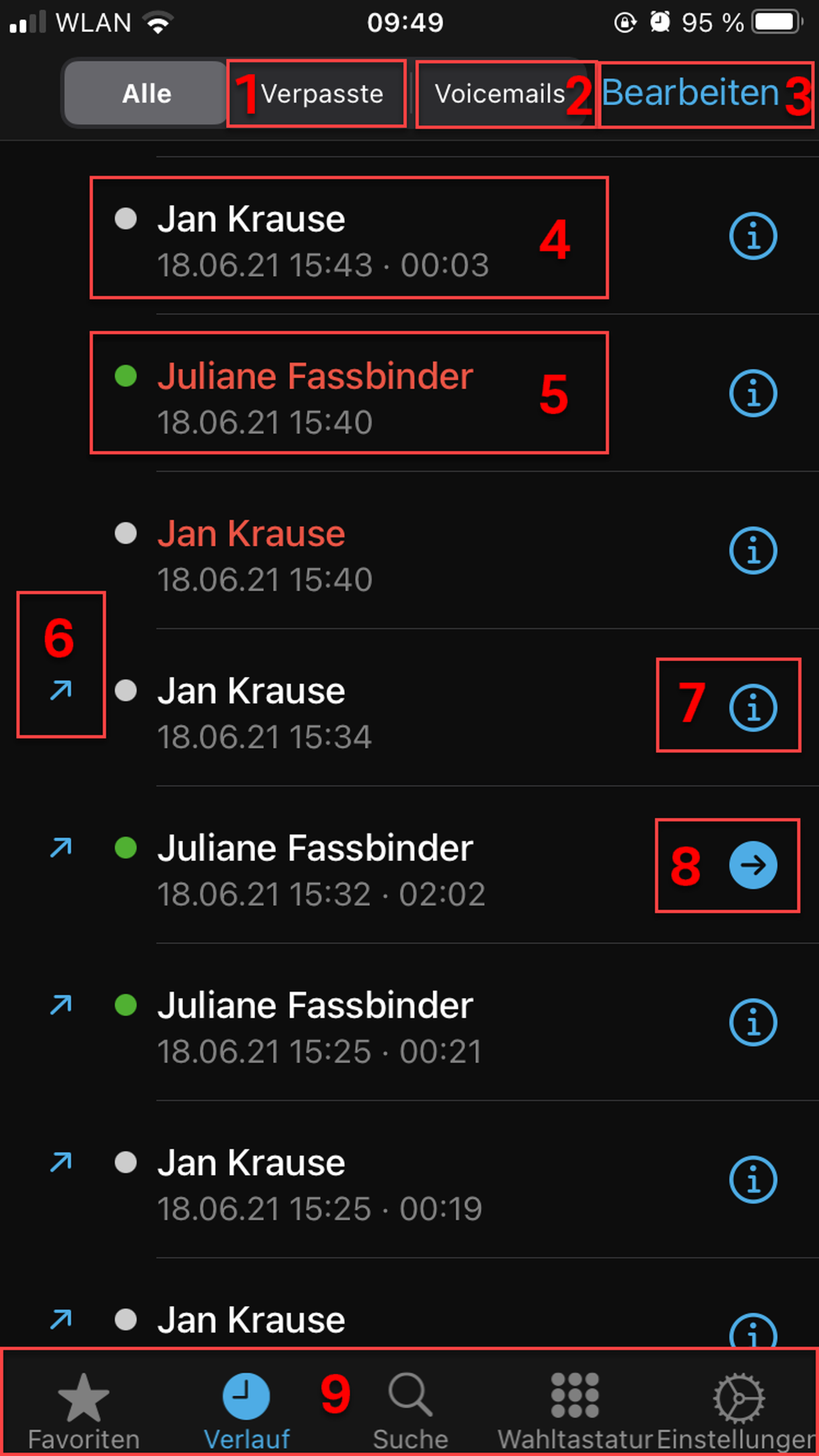 Die Registerkarte Verlauf zeigt eine Liste der letzten Aufrufe. Diese Ansicht kann auf "Voicemails" umgeschaltet werden, um eine Ansicht der letzten Voicemails zu erhalten.