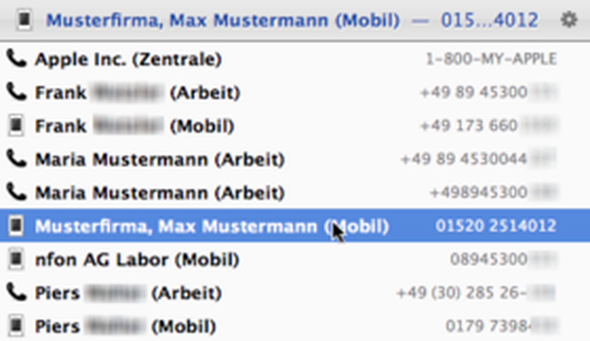 Sobald Sie nun einen Befehl wie "tel" einfügen, werden Ihnen mögliche Telefonnummern aus Ihrem Adressbuch angezeigt. Durch Klicken der Leertaste bei einem markierten Kontakt wird dieser angewählt.