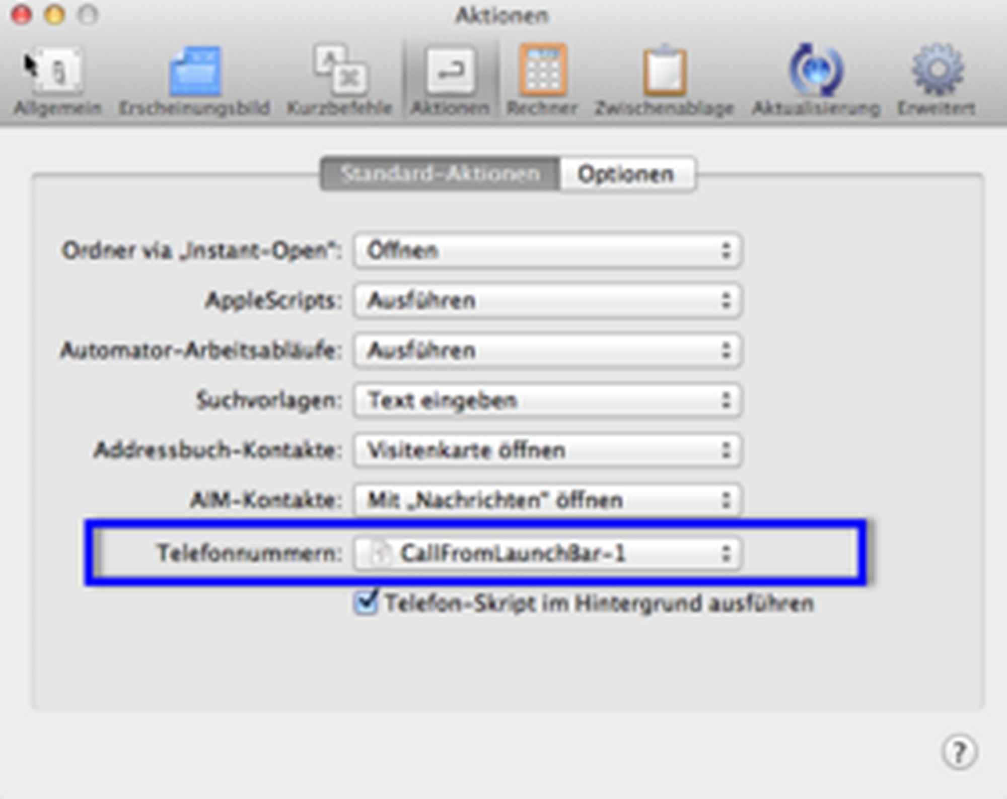 Das AppleScript "CallFromLaunchBar.scpt" bietet Ihnen die Möglichkeit, Anrufe direkt aus der externen Mac OS X Software „LaunchBar“ zu steuern. Bitte beachten Sie jedoch, das LaunchBar eine kostenpflichtige Software ist, welche nicht supportet wird. Auch wird keinerlei Haftung für die aus der Installation von LaunchBar resultierenden Probleme bzw. Schäden übernommen.