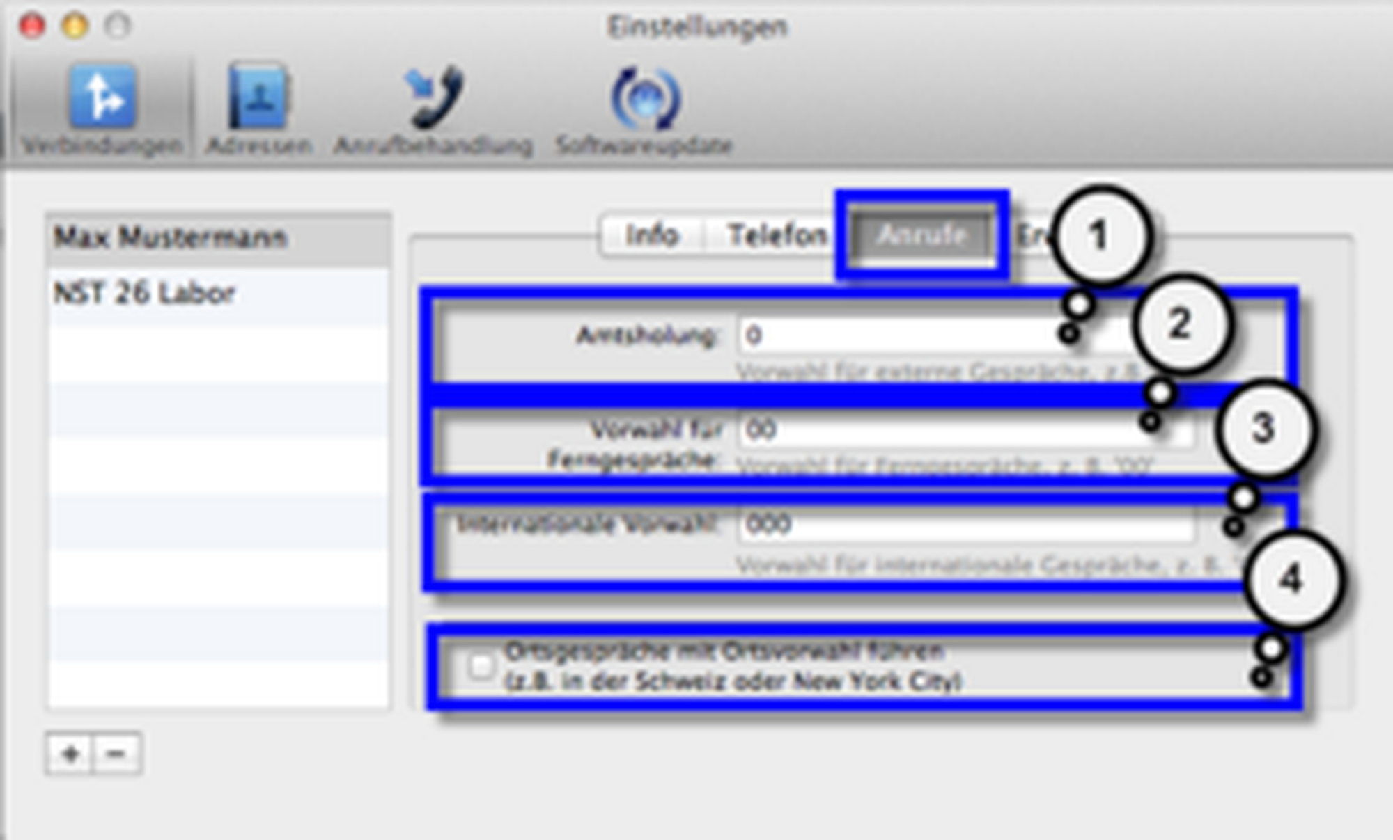 Geben Sie unter dem Reiter "Anrufe" folgende Werte ein: