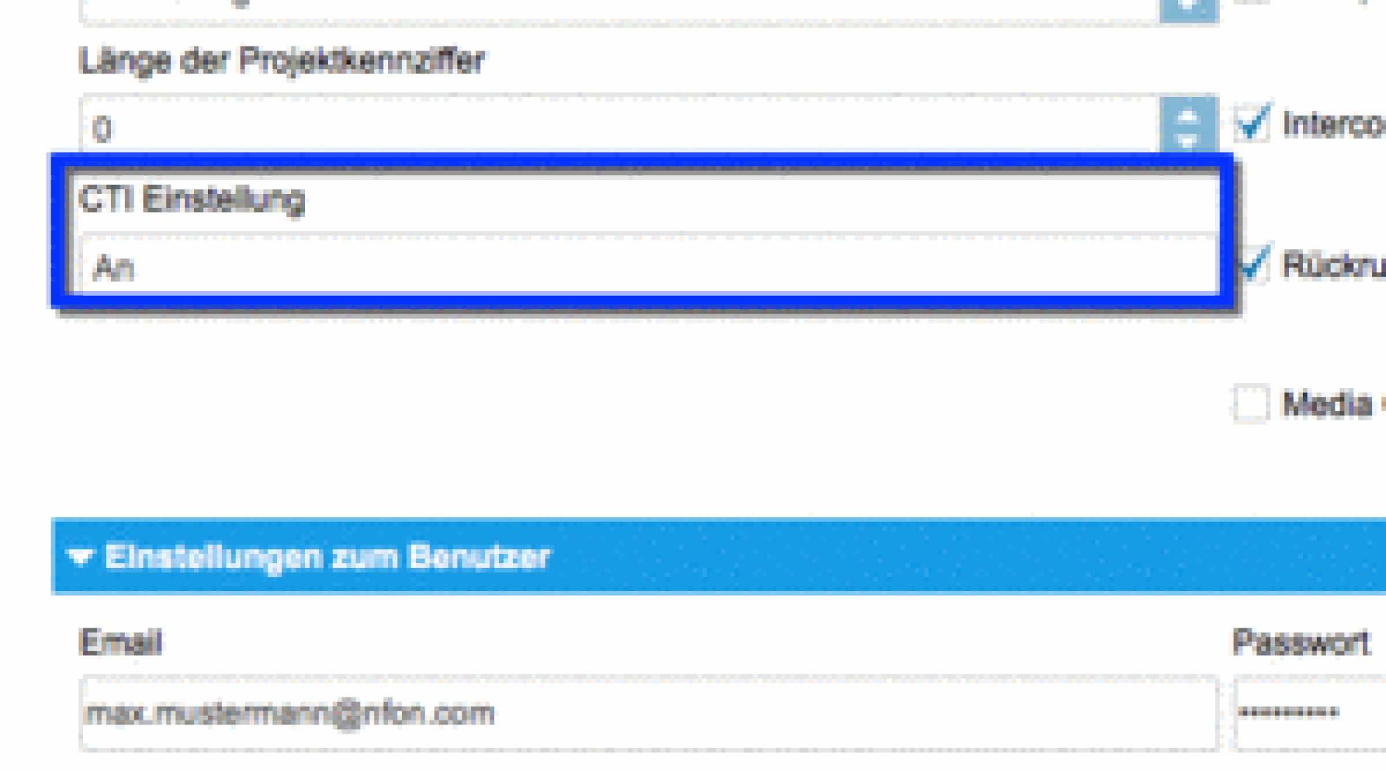 Unter Administration/Profil muss die CTI Option auf "An" eingestellt sein. Bitte kontaktieren Sie dazu Ihren systemtechnischen Ansprechpartner, um diese Funktion für Sie freizuschalten.
