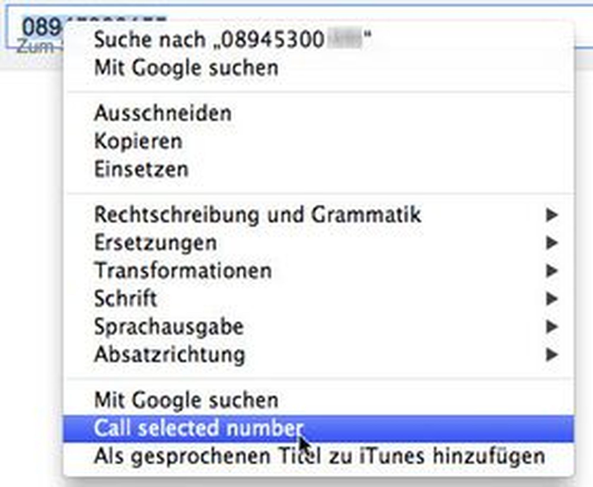 Über den Extras-Ordner erhalten Sie Zugriff auf das AppleScript "Nummer wählen/cw".