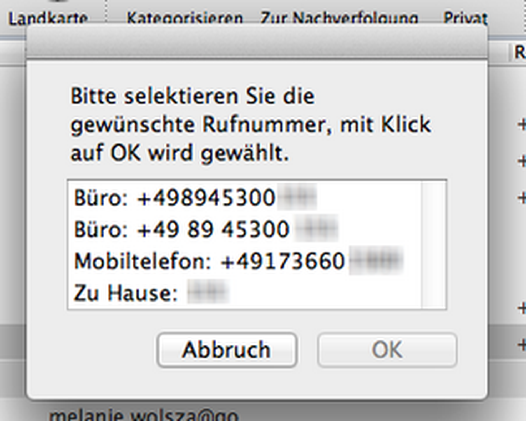 Somit können Sie, falls Sie Ihren gewünschten Kontakt mit mehreren Rufnummern hinterlegt haben, eine bestimmte Rufnummer auswählen und diese mit Klick auf "OK" anrufen.