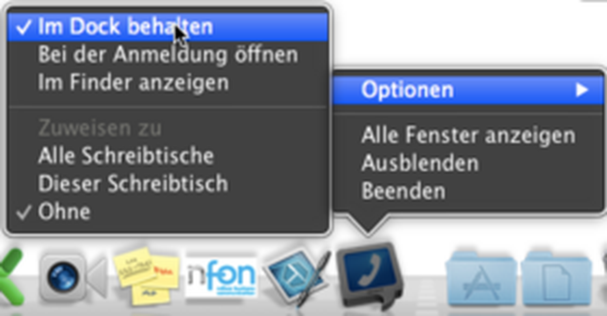 Aktivieren Sie, durch Klick mit der rechten Maustaste auf das Programm im Dock, die Option „Im Dock behalten“.