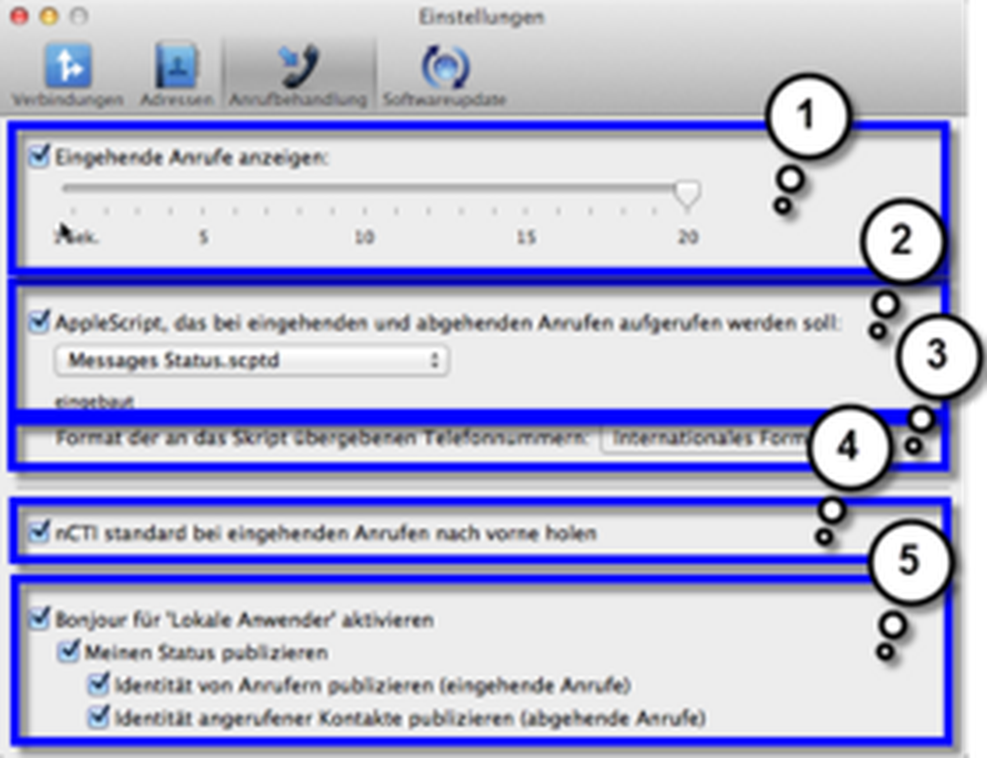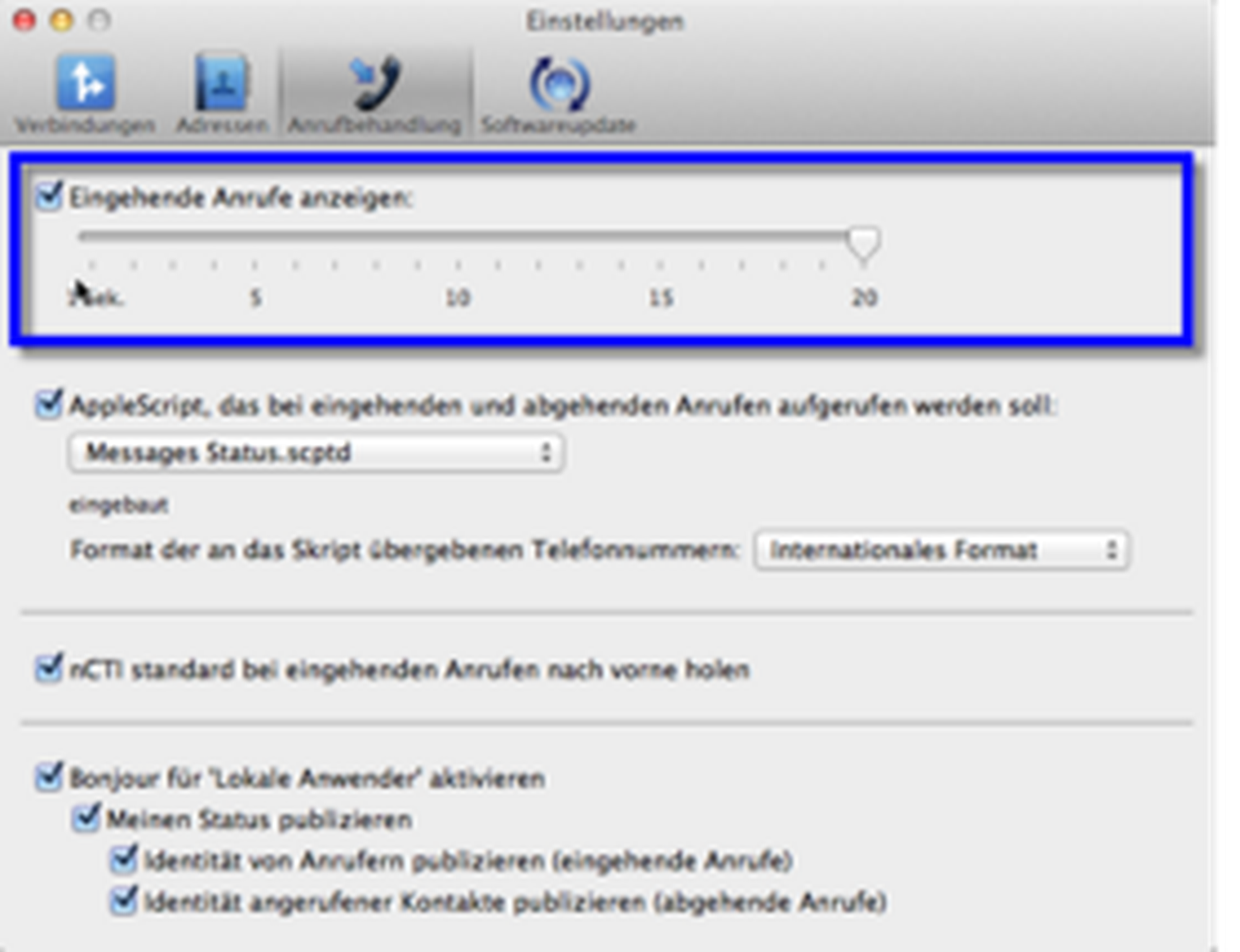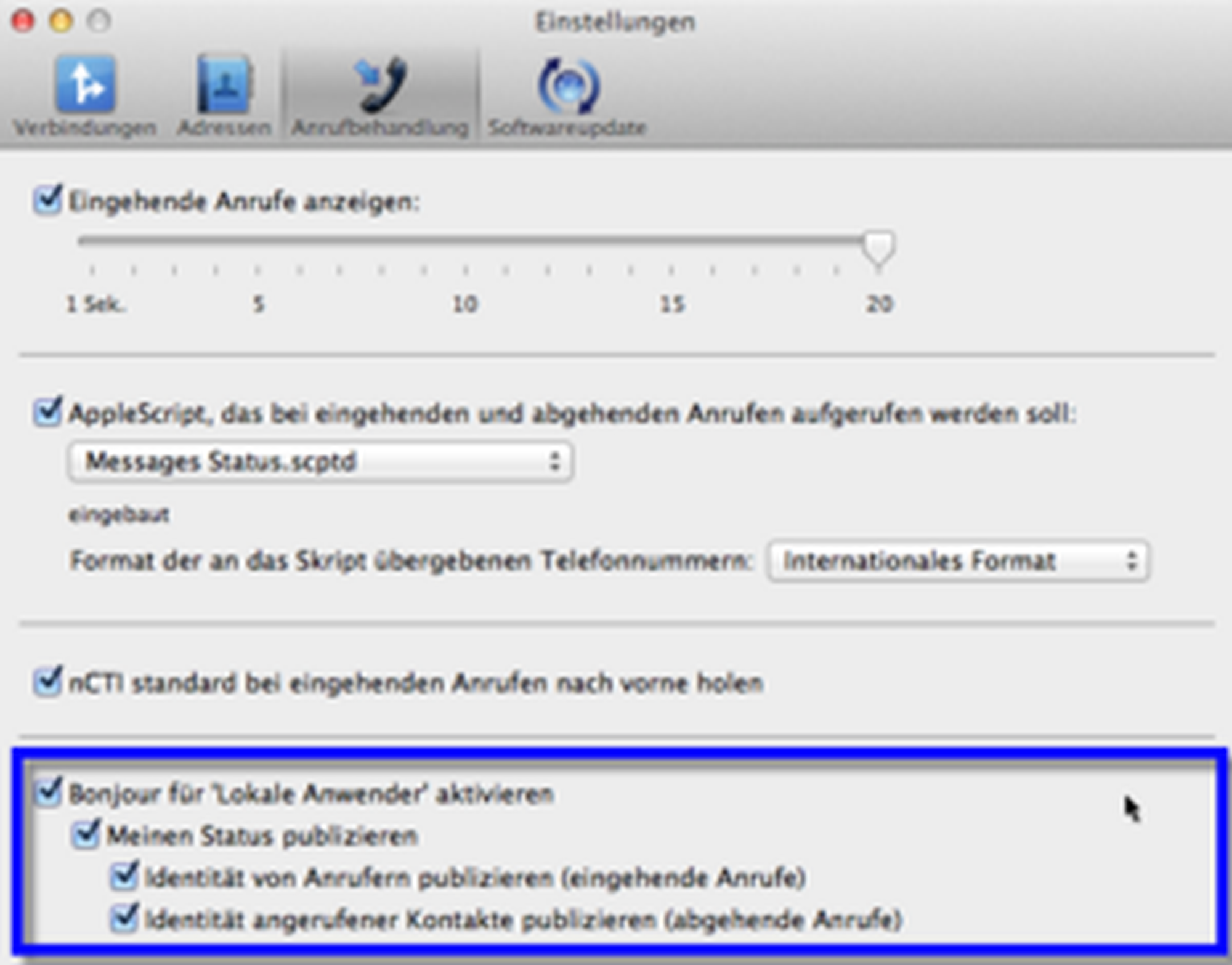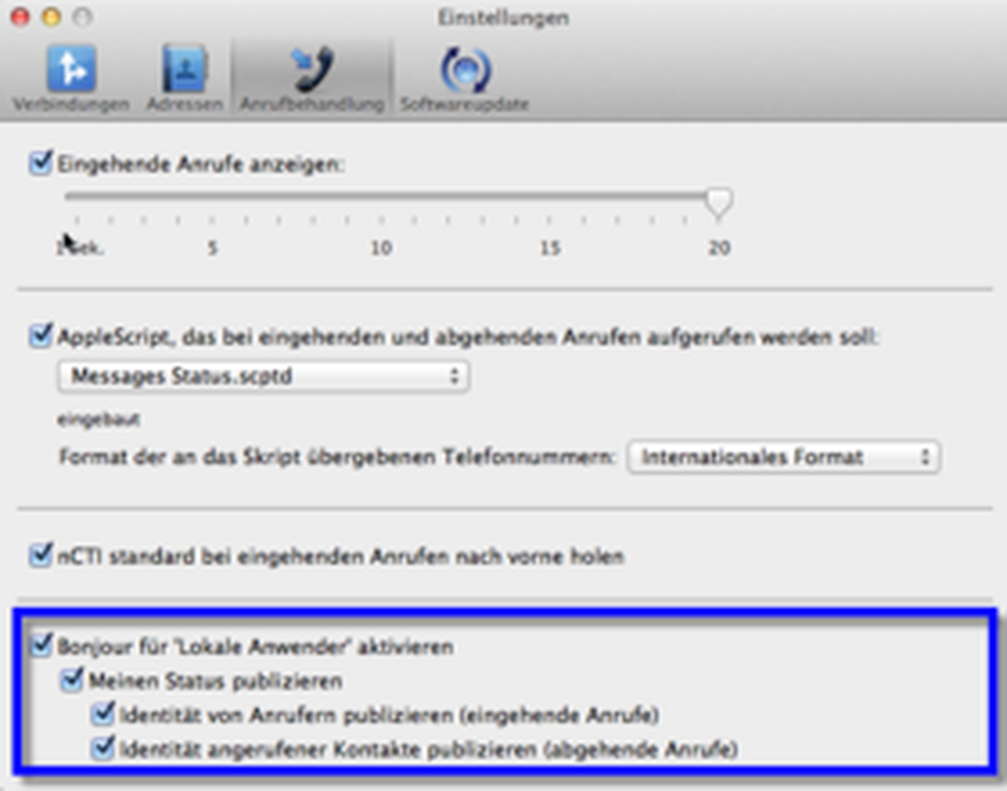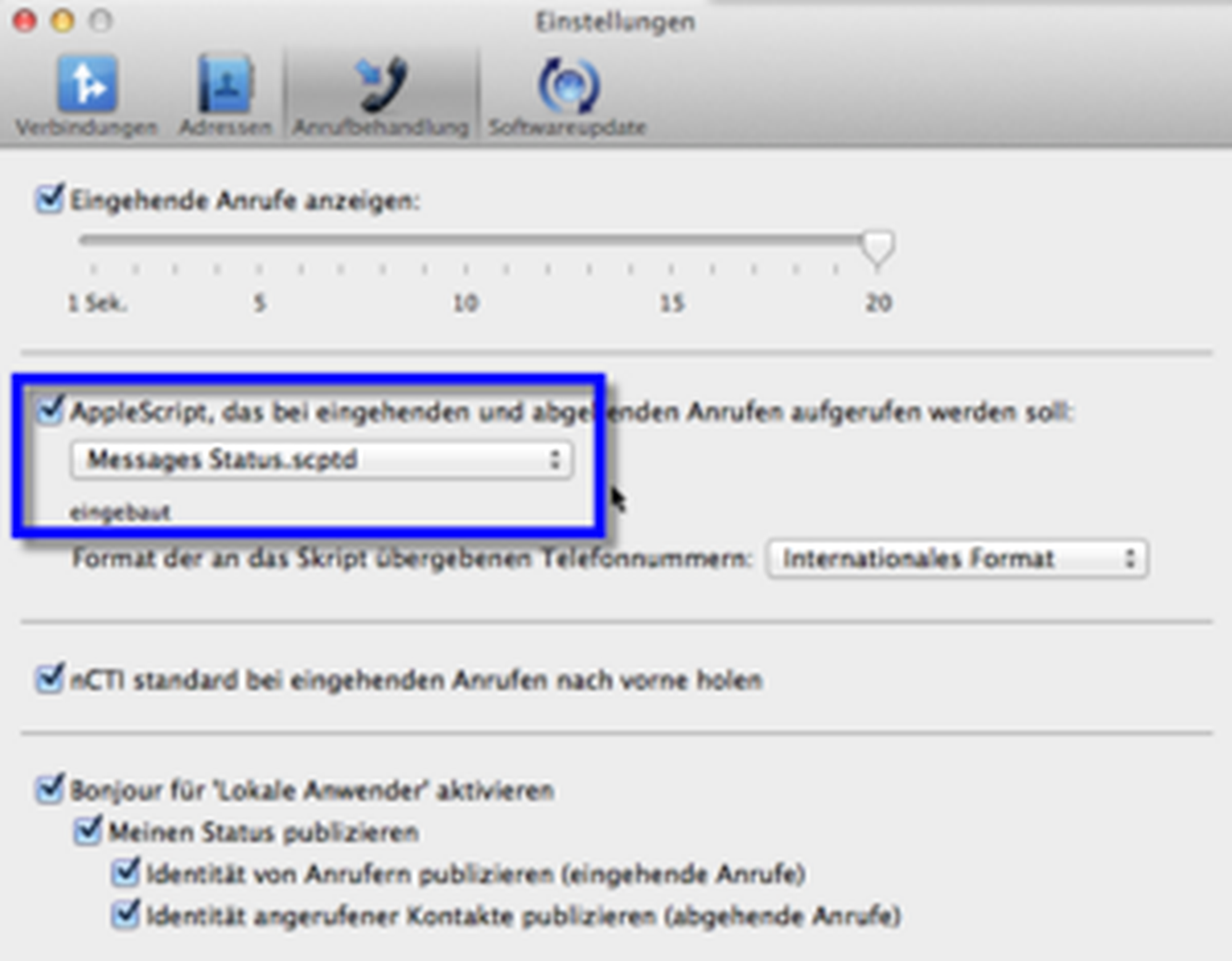 Hierzu müssen Sie in den Einstellungen definieren, welches Script bei ein- und ausgehenden Anrufen aufgerufen werden soll. Setzen Sie den Haken im Reiter "Anrufbehandlung" und wählen Sie entweder das Script "Adium Status.scptd" oder das "iChat Status"- bzw. "Messages"-Skript entsprechend Ihrem Mac OS X Betriebssystem aus.