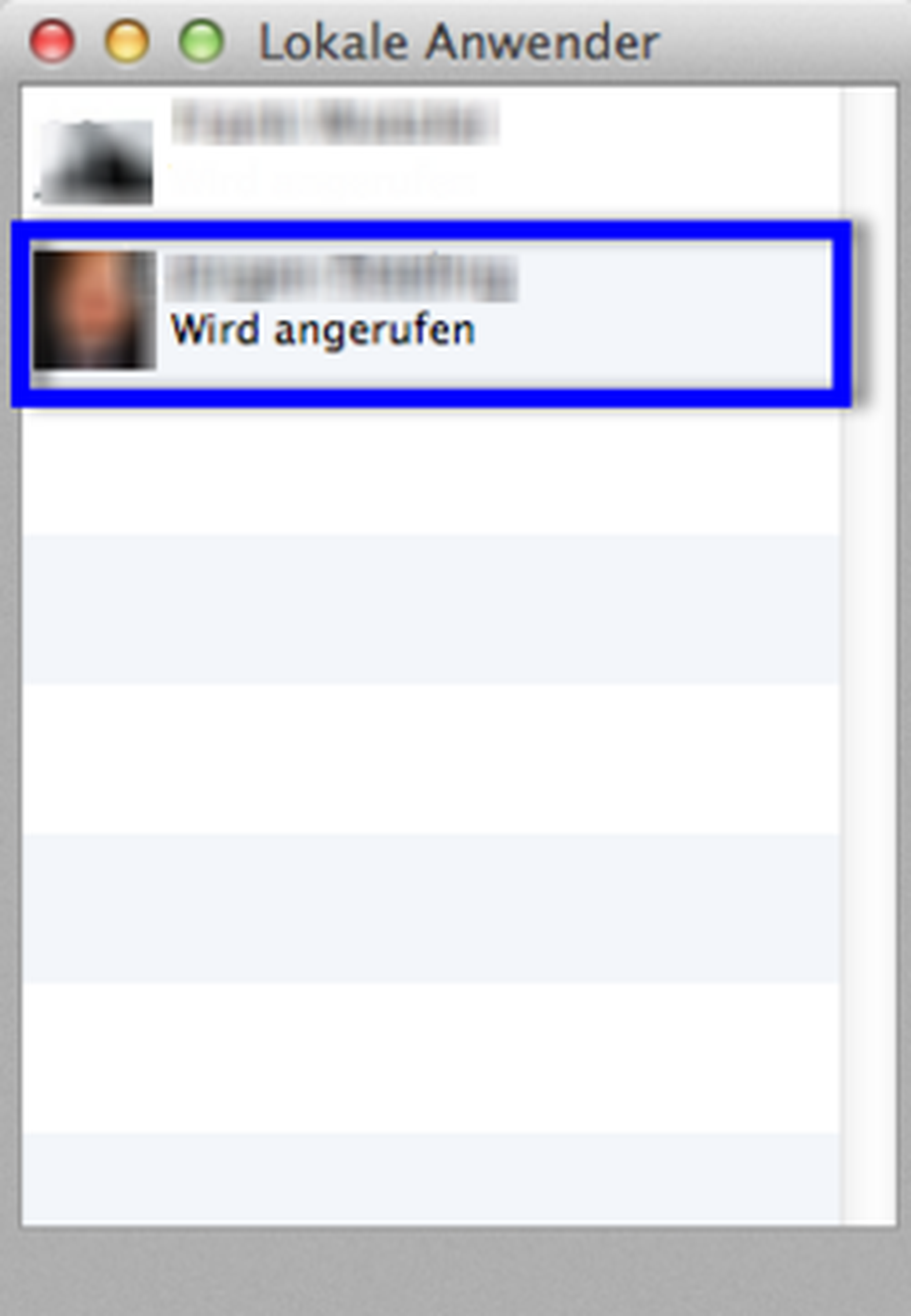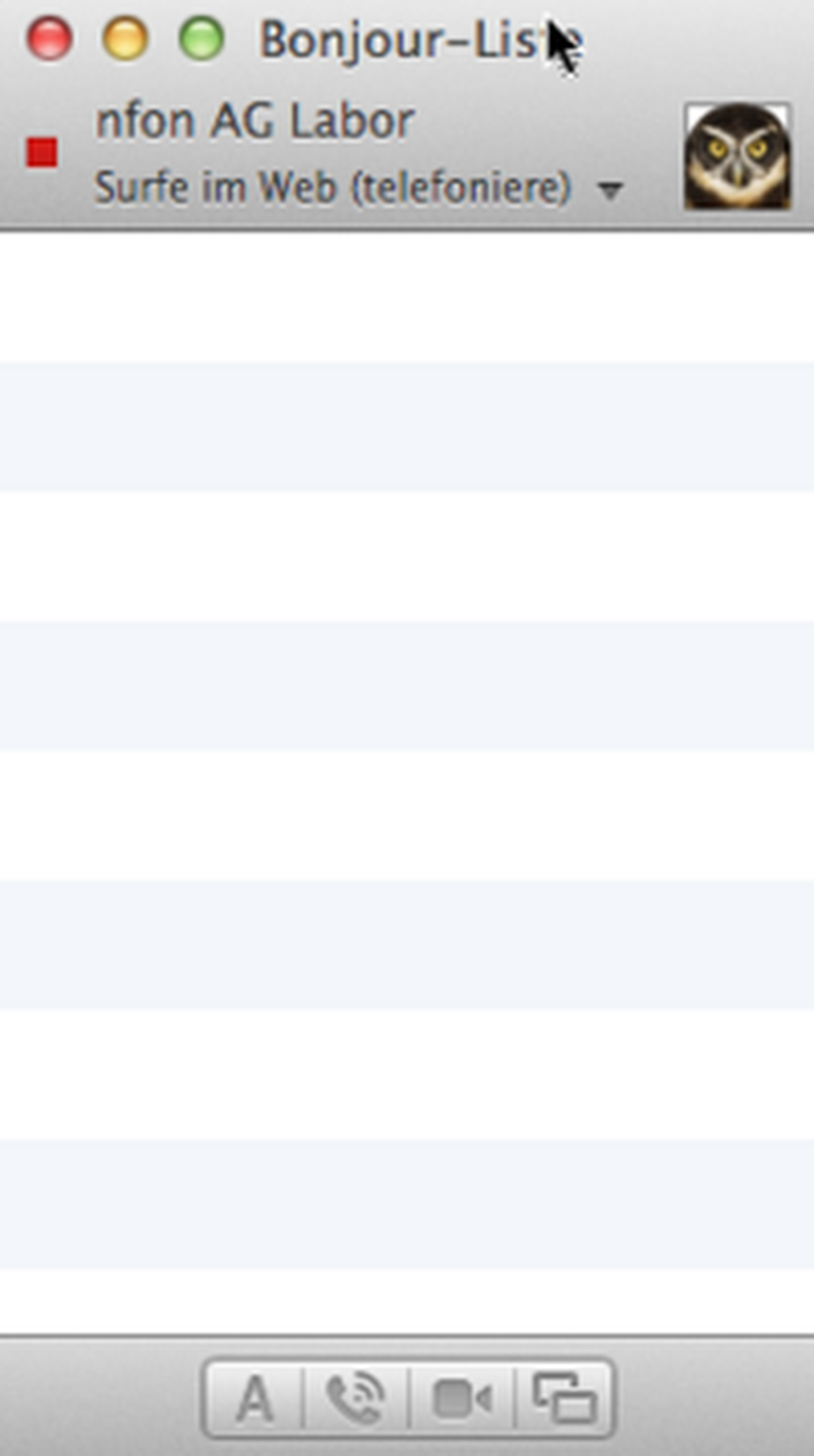⇒Daraufhin erscheint Ihre Bonjour-Liste, in dieser nochmal alle Kontakte mit entsprechendem Status aufgelistet sind. Zudem wird Ihren Kontakten nochmal Ihr eigener Status mitgeteilt.