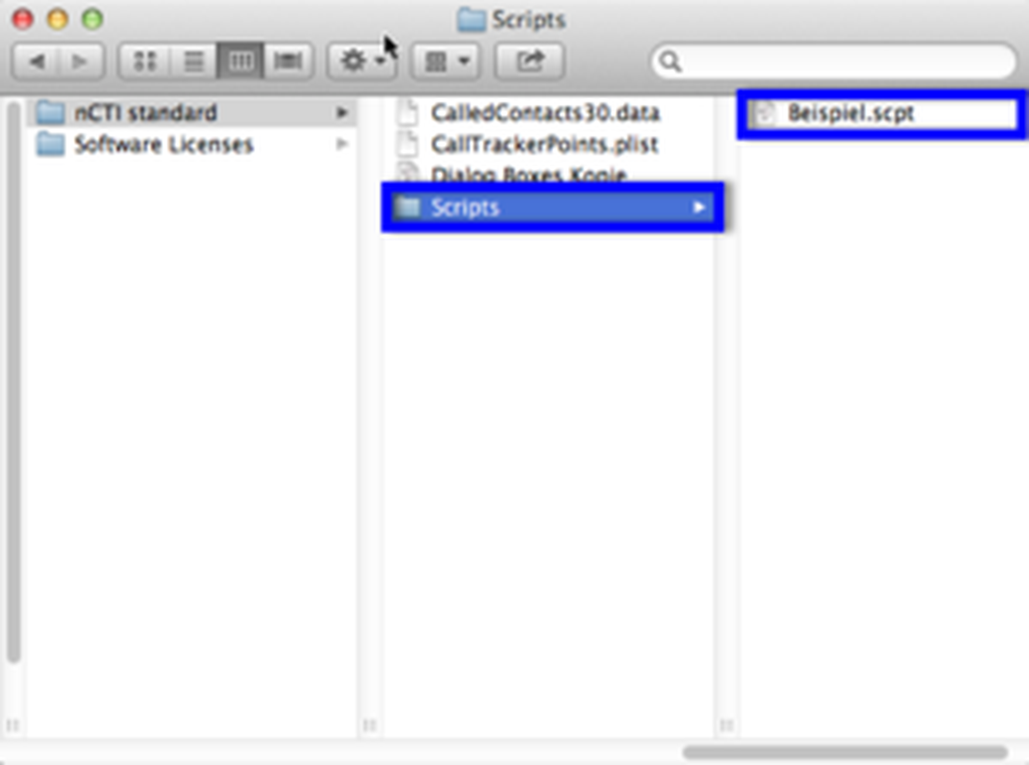 In diesem Fall handelt es sich um den Ordner ~/Library/Application Support/Nfon/NCTI standard/Scripts. Die Skripte können entweder im Textformat (mit dem Suffix .applescript) oder als kompilierte Skriptdateien (mit dem Suffix .scpt) vorliegen.