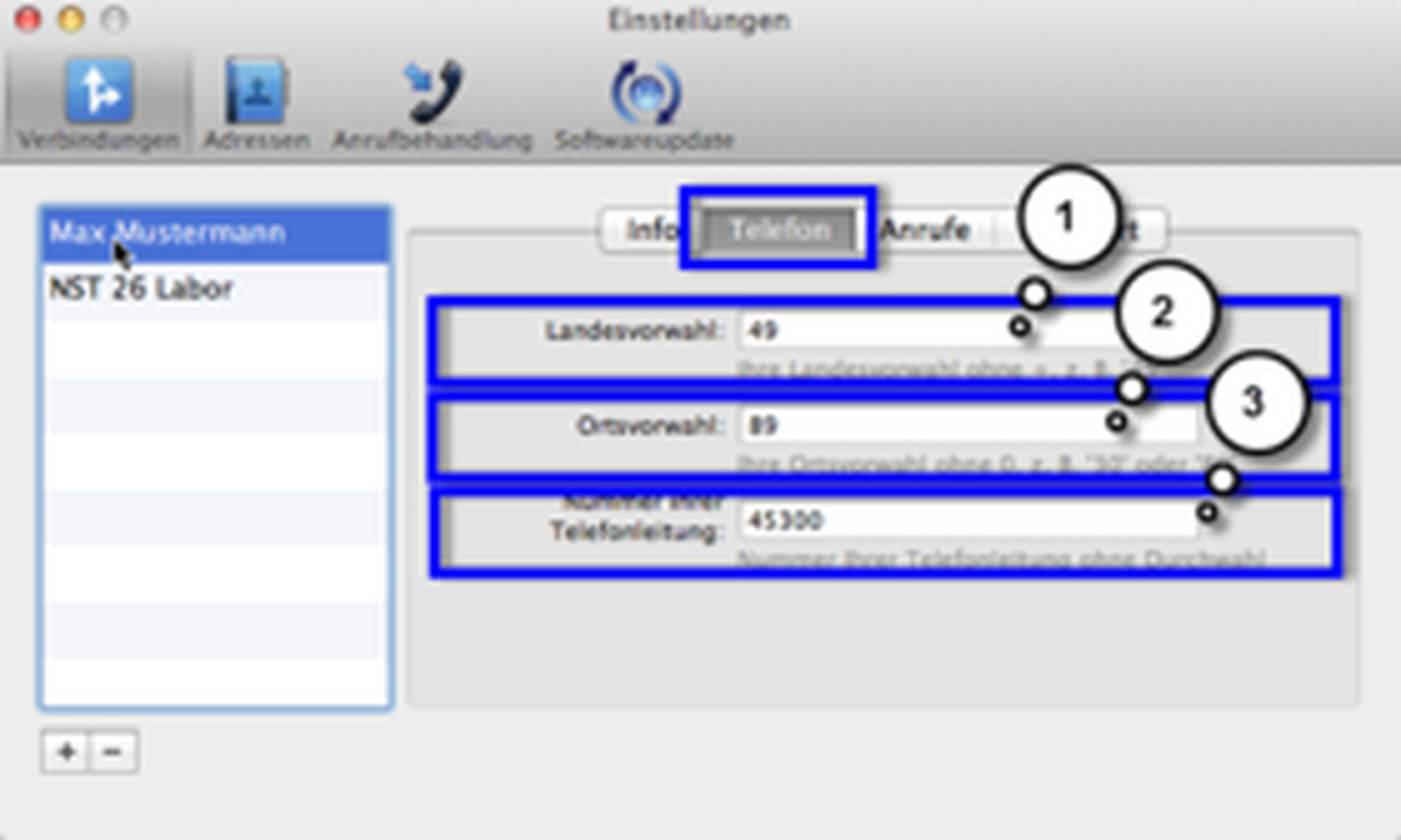 Im Reiter "Telefon" können Sie Ihre Landes- und Ortsvorwahleinstellungen sowie die Nummer Ihrer Telefonleitung festlegen.