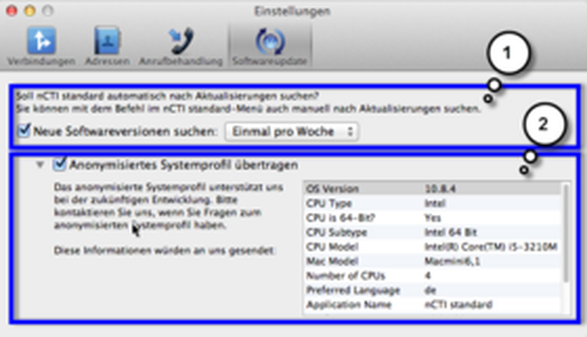 Um Ihren NCTI standard Client regelmäßig auf die neueste Version upzudaten und somit alle Funktionalitäten vollständig gewährleistet werden können, setzen Sie einen Haken bei "Neue Softwareversionen suchen".