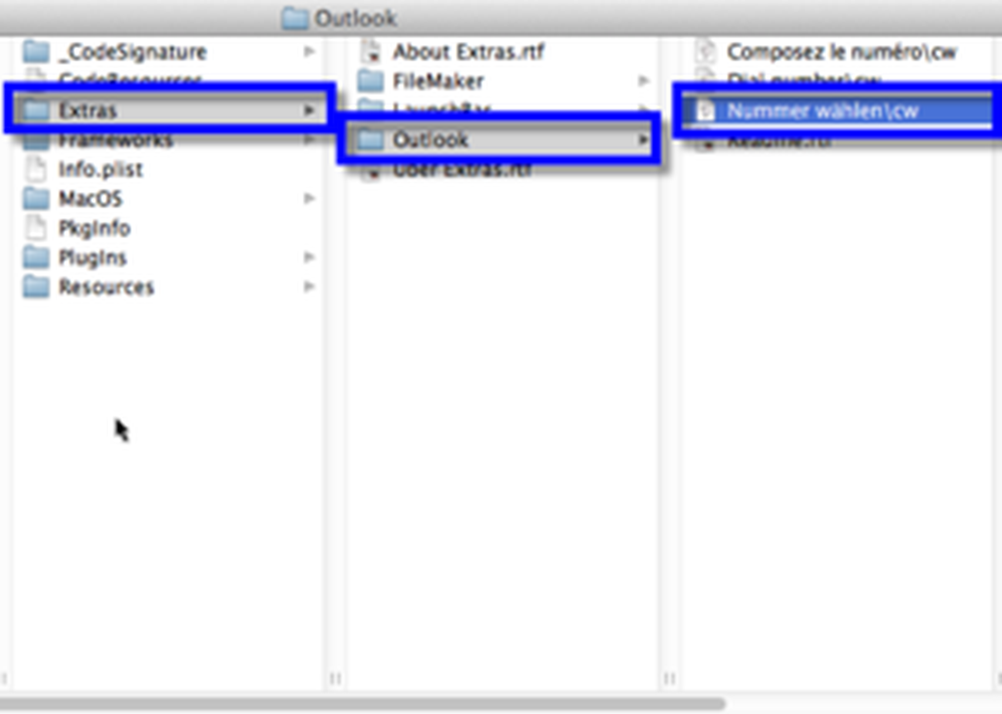 Über Contents/Extras/Outlook gelangen Sie zum AppleScript "Nummer wählen/cw".