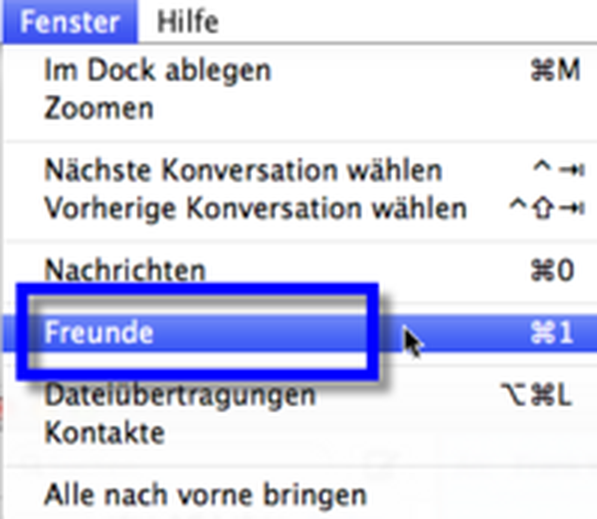 Um die An- oder Abwesenheitsstati Ihrer Freunde einsehen zu können, holen Sie sich das Freunde-Fenster über den Menüpunkt "Fenster" und mit Klick auf "Freunde" her.