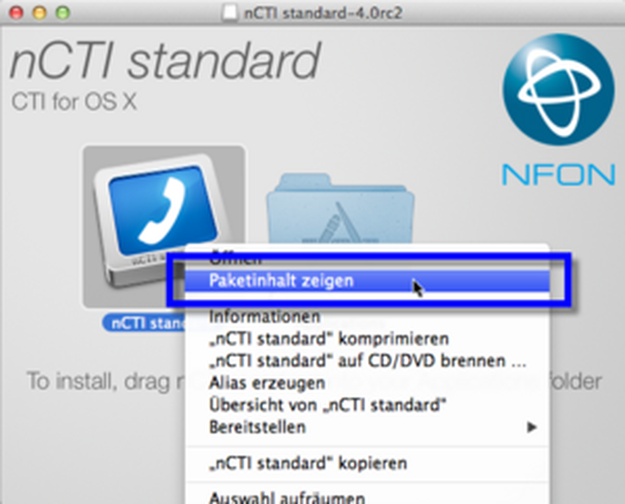 Klicken Sie dazu mit rechter Maustaste auf das Icon "NCTI standard" im Disk-Image und wählen Sie "Paketinhalt zeigen".